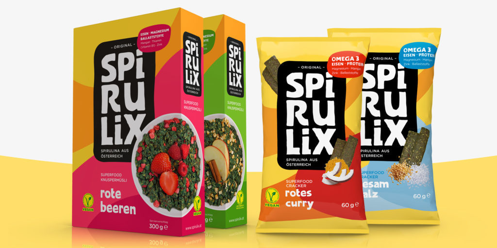 Spirulix stellt Produkte aus „Algen made in Austria“ her. Es galt, für den Launch in Österreichs Supermarktregale, die Positionierung zu schärfen und darauf basierend ein Rebranding für die Marke Spirulix zu entwickeln. Das beinhaltete die Analyse der bestehenden Unterlagen, Research und Screening aktueller Trends in der Category, die gemeinsame Ausarbeitung einer Mitbewerber- und Zielgruppenanalyse, die Entwicklung der Tone of Voice sowie der Wertewelt, die Konzeption einer visuellen Verpackungs-Range und die anschließende Druckunterlagenerstellung für die Produktion der Packagings für Granola (Faltschachtel), Cracker (Folienbeutel), Nougats (Schleife & Showboxes), sowie Powder & Flakes (Dosen).